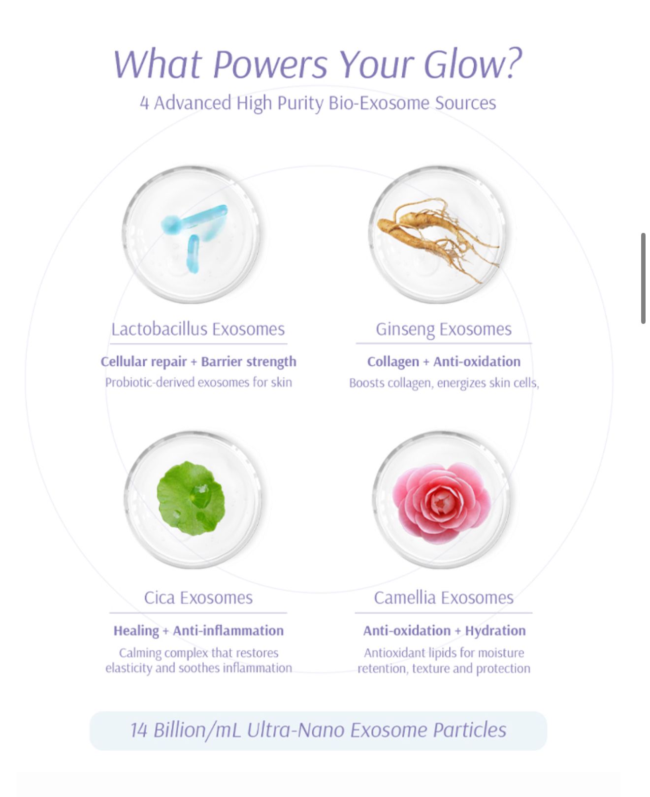 Ultra-nano exosomes sourced from four botanical origins to support cellular communication, barrier repair, calming, and antioxidant protection.